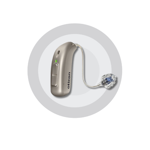 Oticon Real miniBTE R is a small, rechargeable hearing aid that fits most people's ears. It brings back the real sounds of life using technology that supports how your brain naturally works. Featuring telecoil and a single push-button, plus Bluetooth® wireless technology to support hands-free communication and seamless connectivity with your favorite devices.
